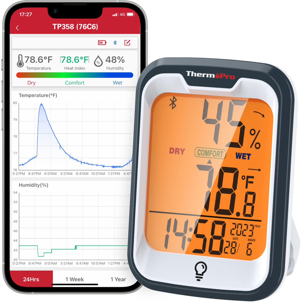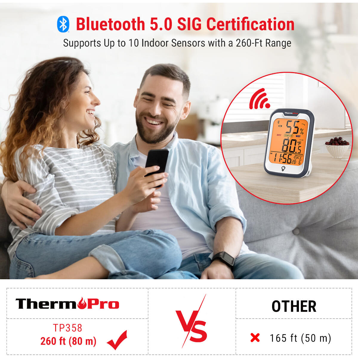 ThermoPro Bluetooth binnenthermometer en hygrometer – TP358 – ±0,9 °F/±2 % RV, bereik van 80 m, verlicht LCD-scherm en app-meldingen