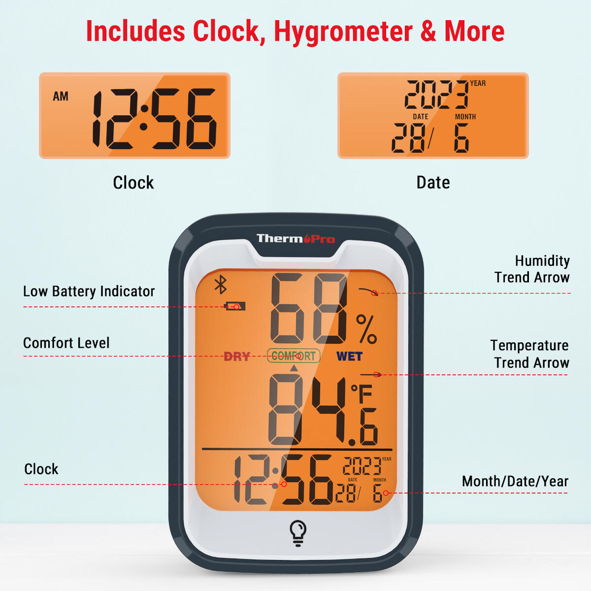 - Alles-in-één display: comfortpictogram, trendpijlen, klok en groot scherm met achtergrondverlichting. Zo weet u direct of de lucht droog, ideaal of vochtig is :contentReference[oaicite:4]{index=4}.