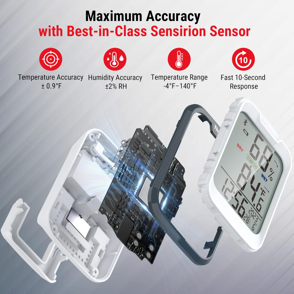 - Nauwkeurigheid van ±0,9 °F (±0,5 °C) temperatuur en ±2% RV; elke 10 seconden scannen op nieuwe gegevens